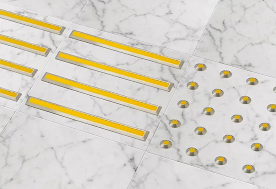 視覚障がい者向けの歩行補助材。 安全な歩行空間を提供し、公共施設や交通機関で活躍。