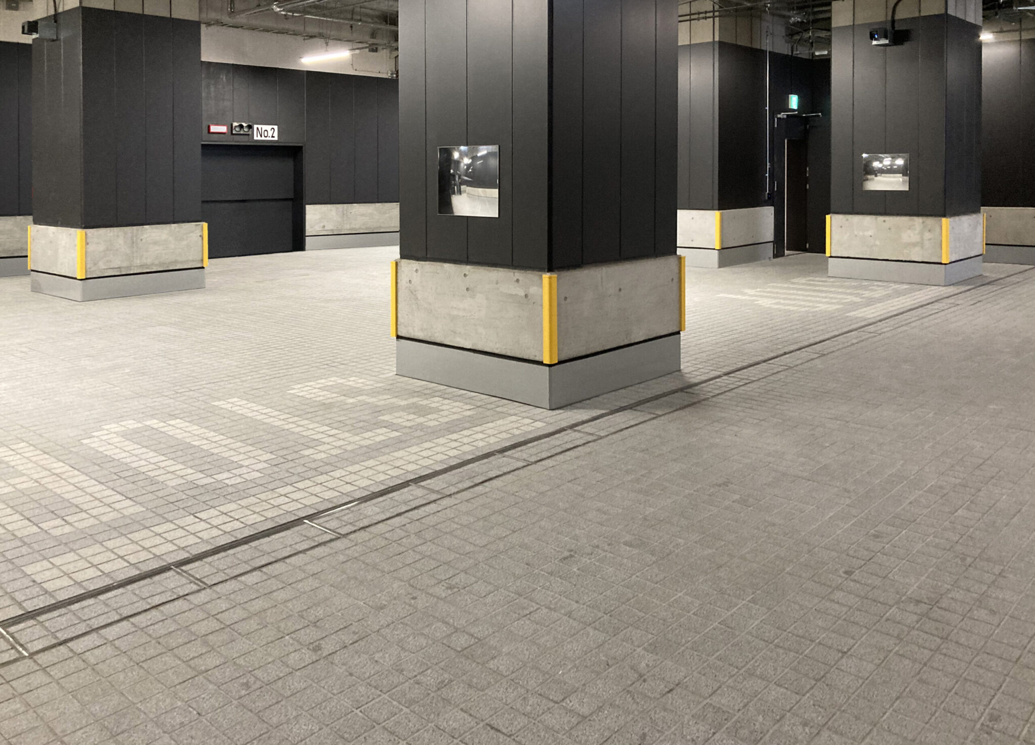 しかし、イベントも行うステージのある屋外施設であることから、イベント時に配線を納める溝も縦横に配置されることとなり、溝に受枠を設け、ステンレスの化粧蓋を敷いたうえで石を貼る納まりに変更しました。