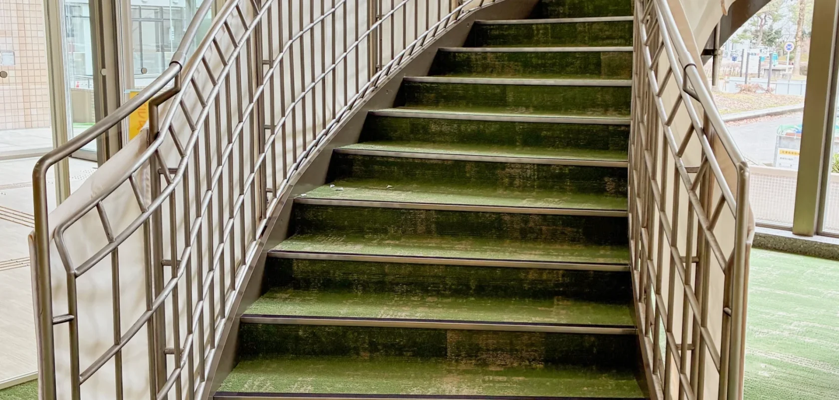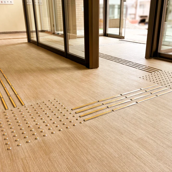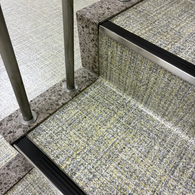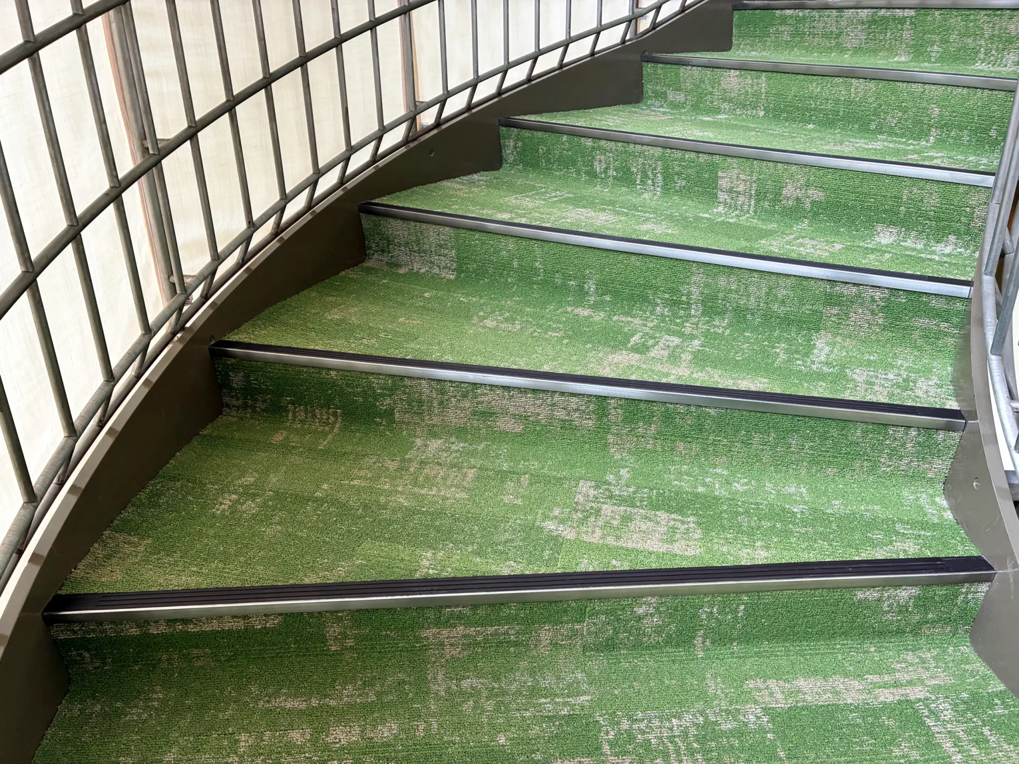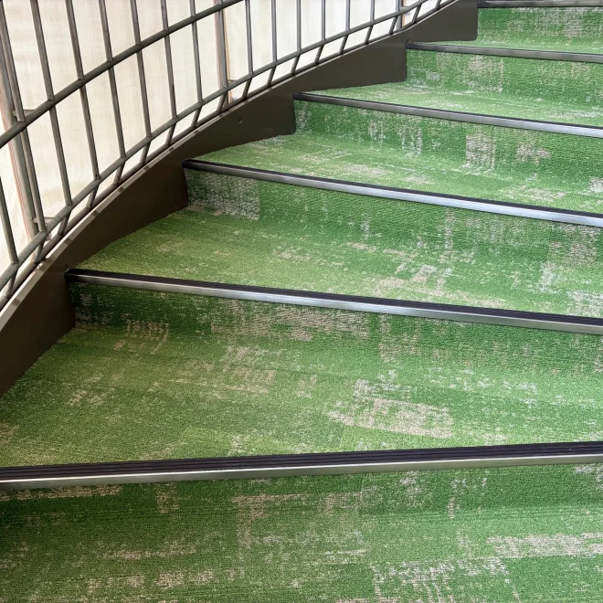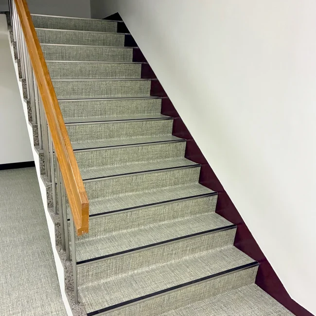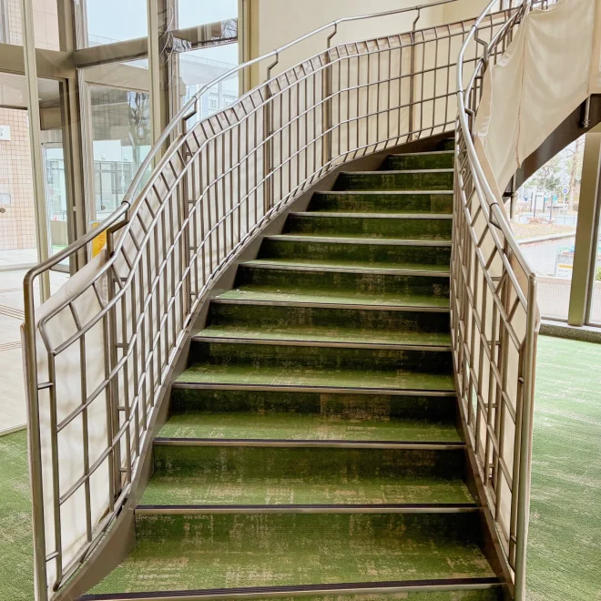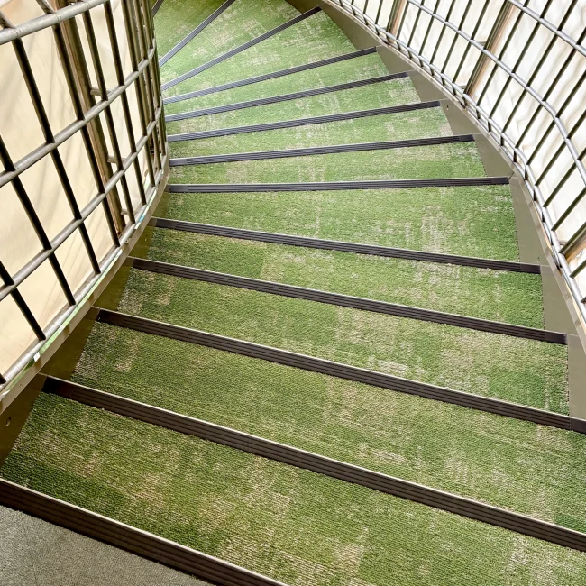 鉄板階段への取付にあたり、段裏にビス先端が出ないよう配慮し、下地材で高さを調整しています。