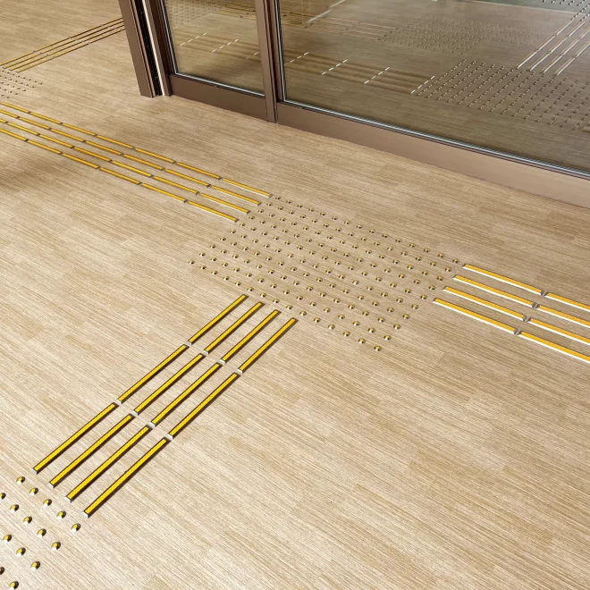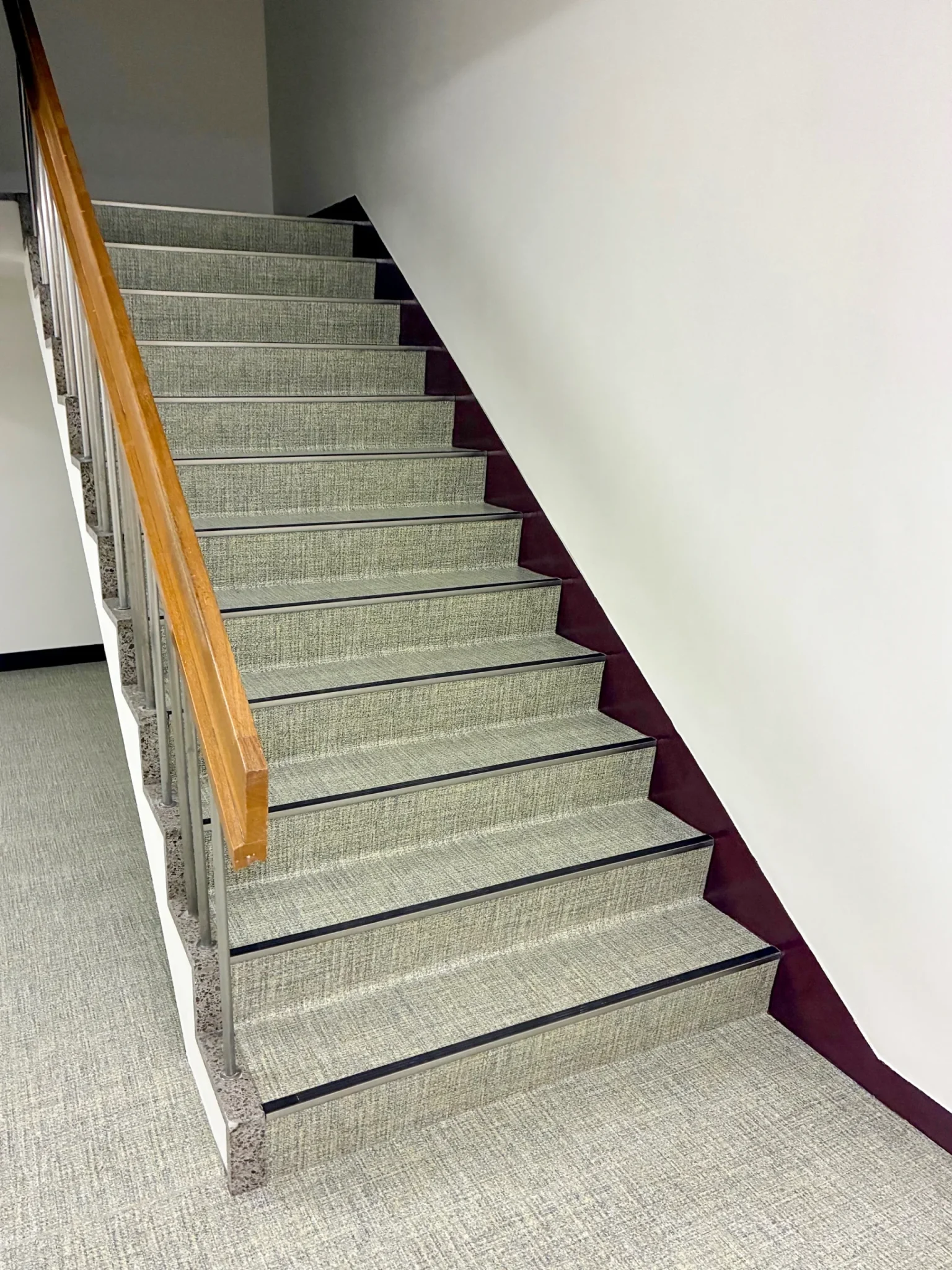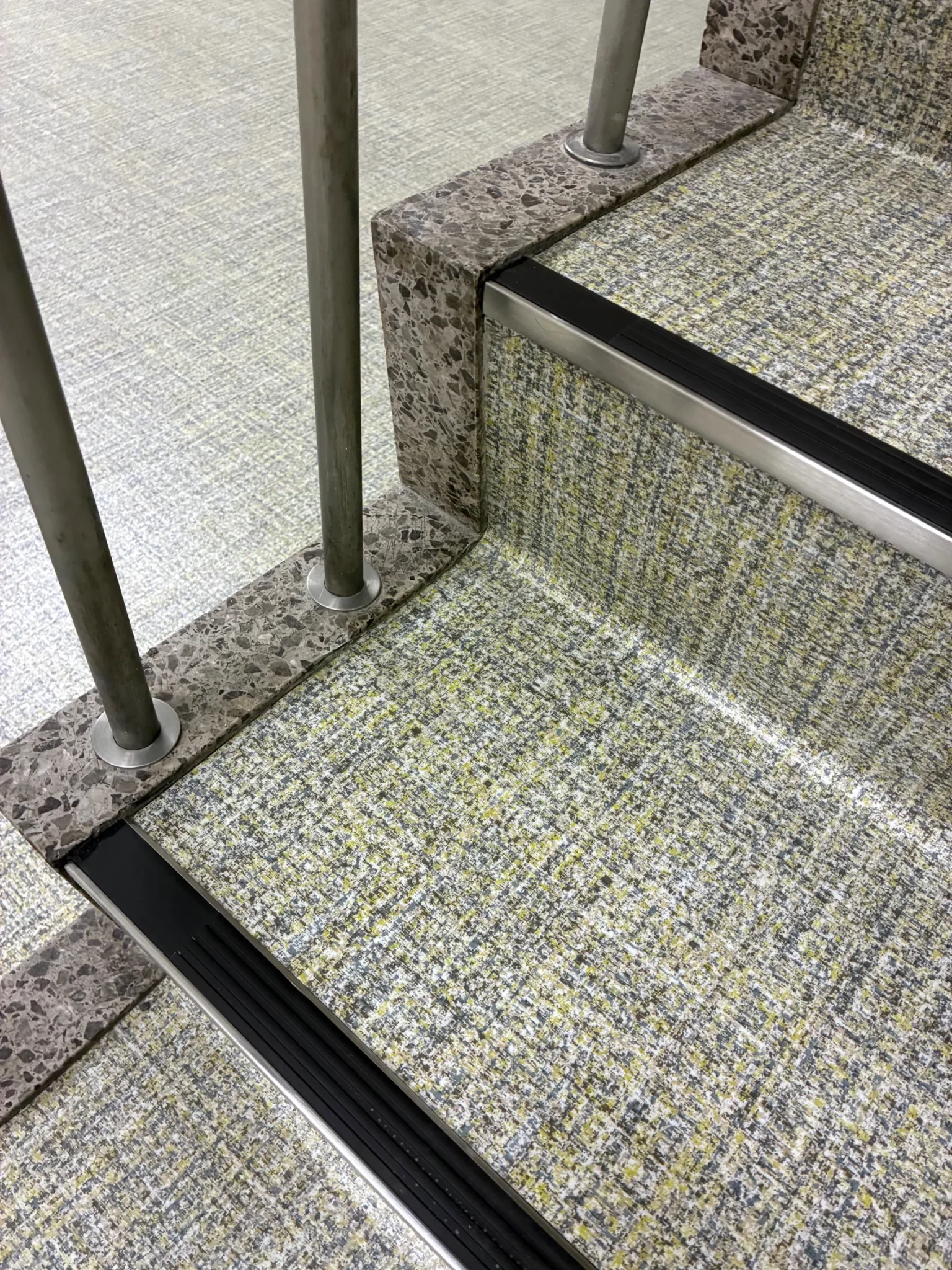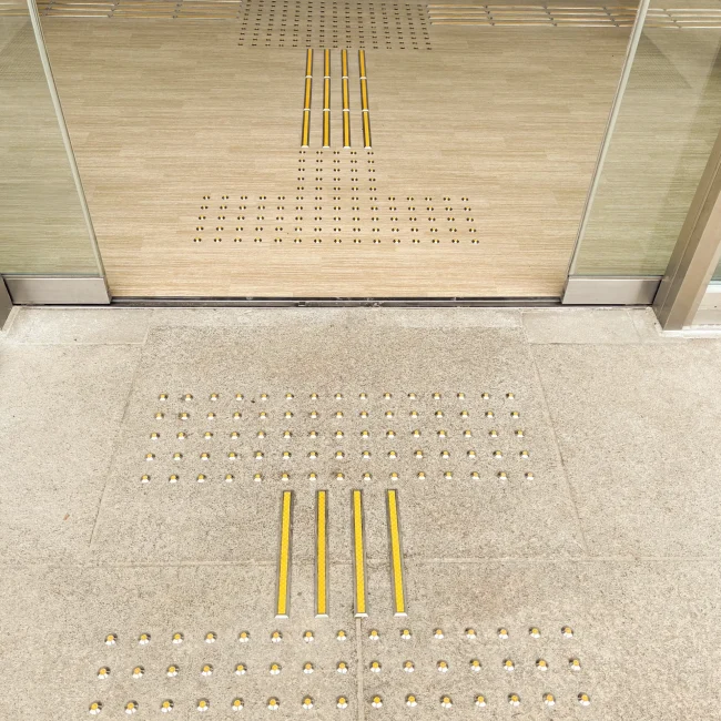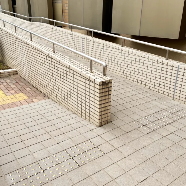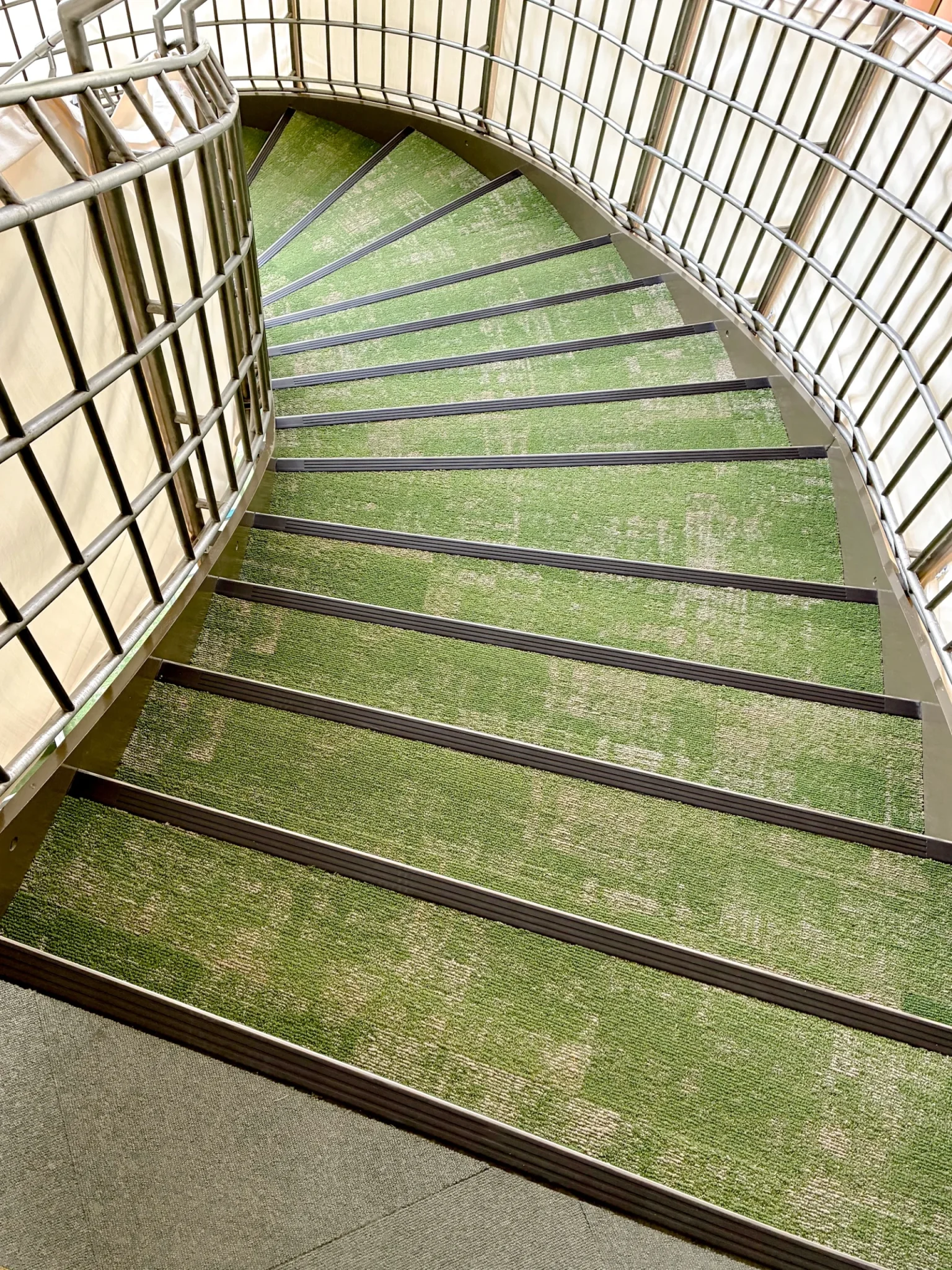 鉄板階段への取付にあたり、段裏にビス先端が出ないよう配慮し、下地材で高さを調整しています。