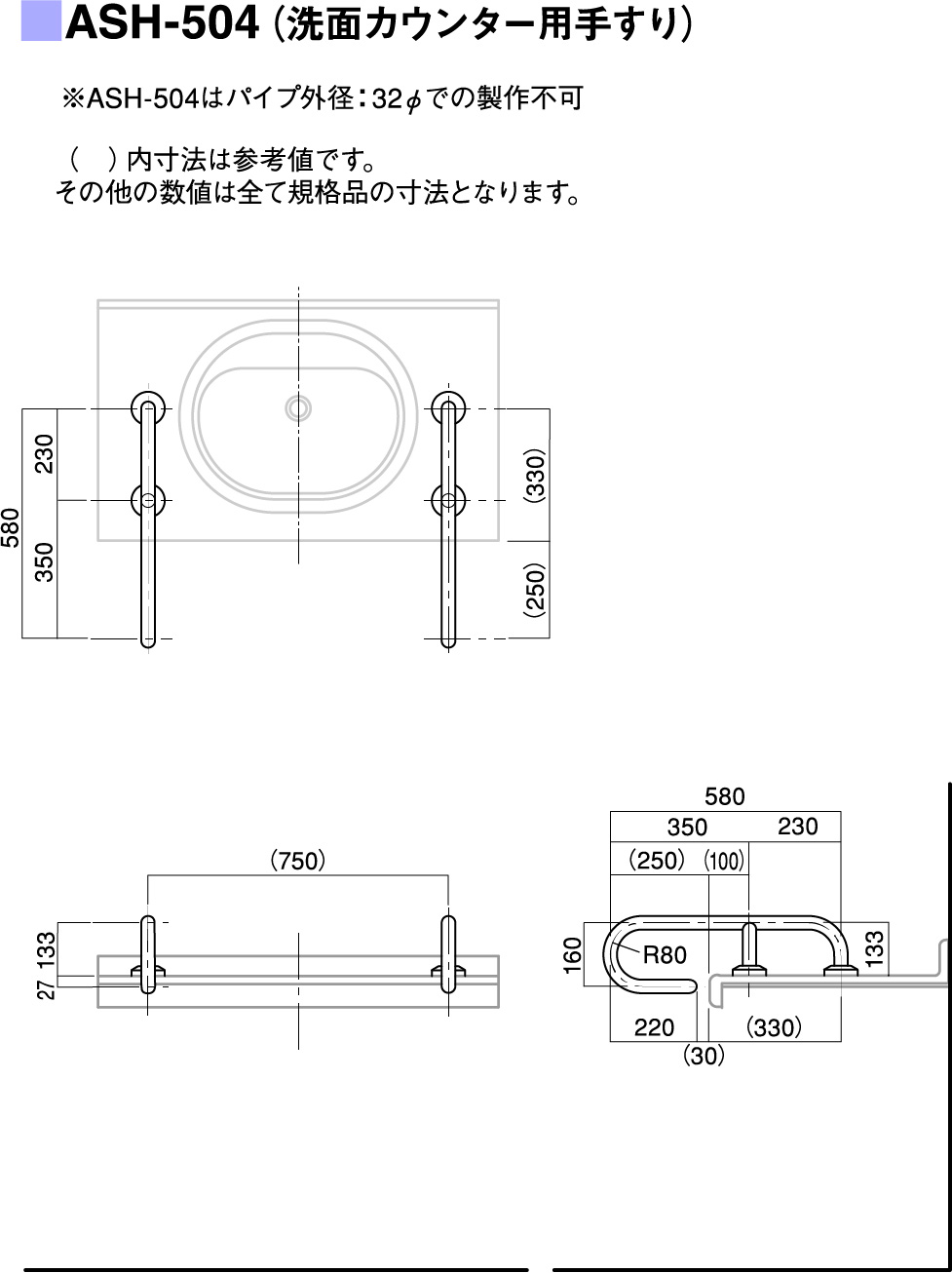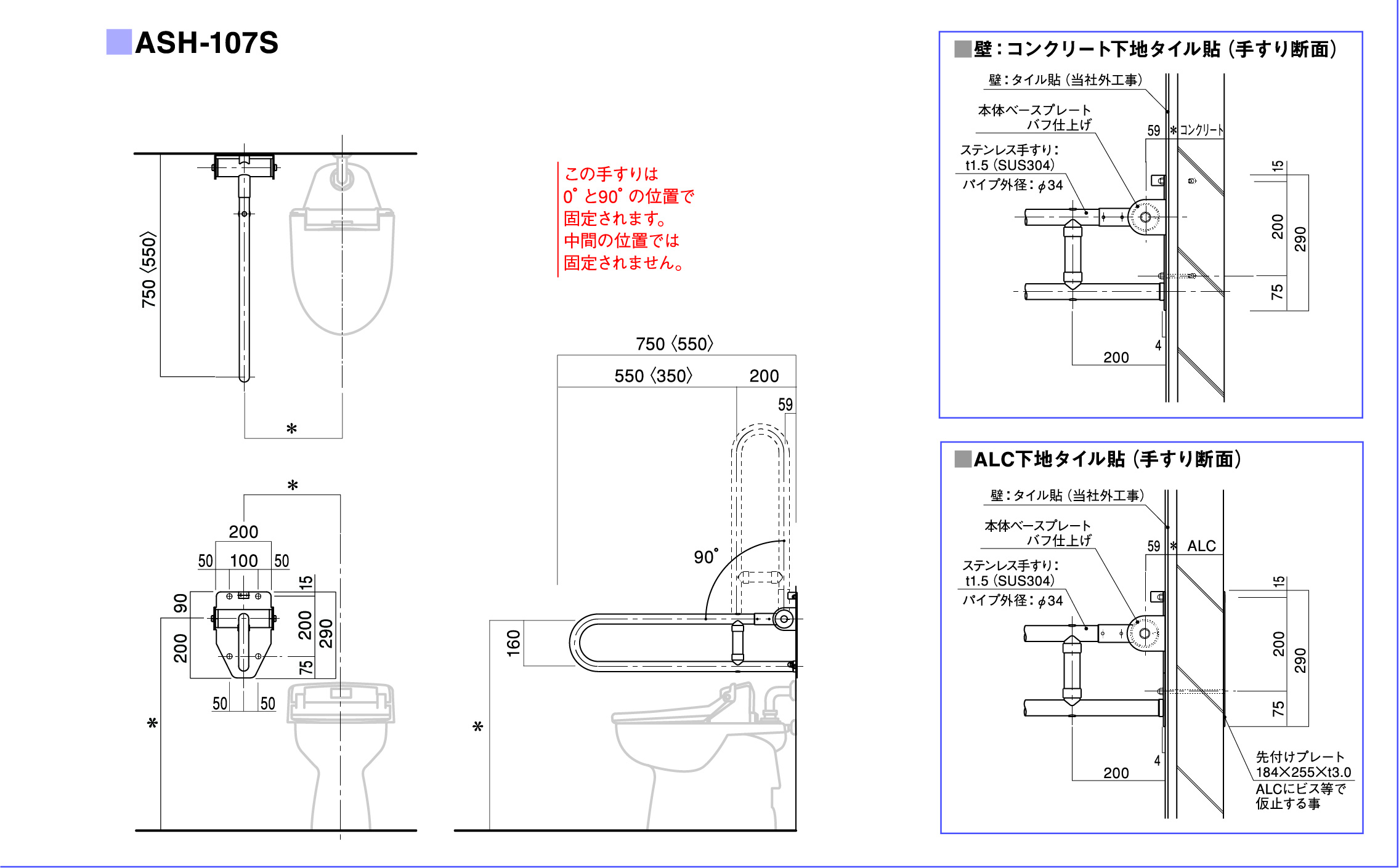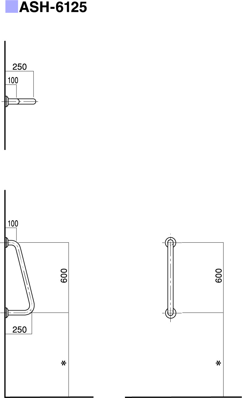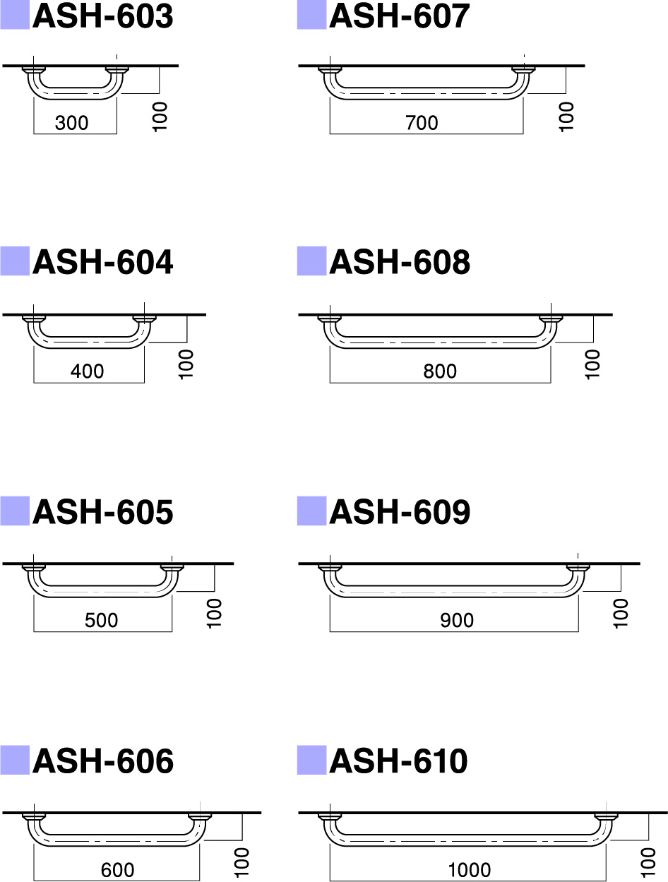 | パイプ外径 | Φ32、Φ34、Φ38 (可動式手摺り:ASH-105S・107Sについては、φ34のみ) |