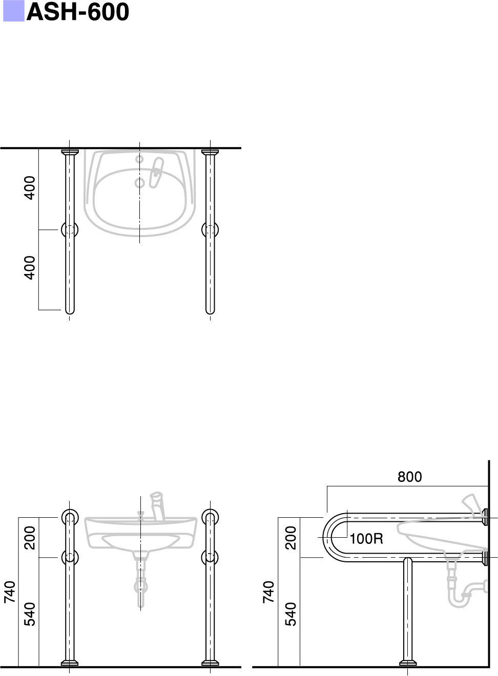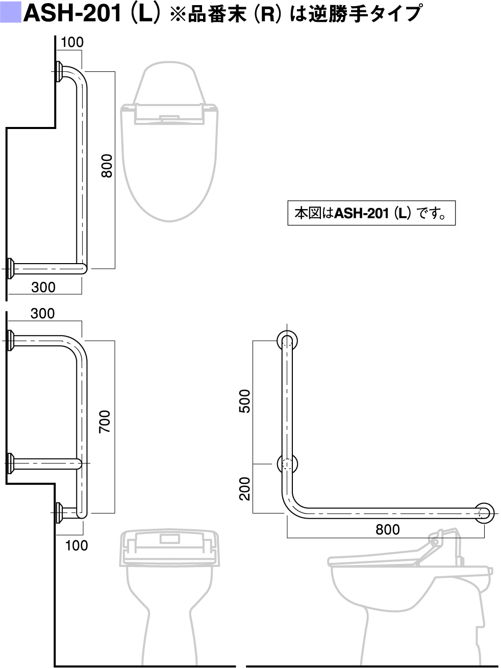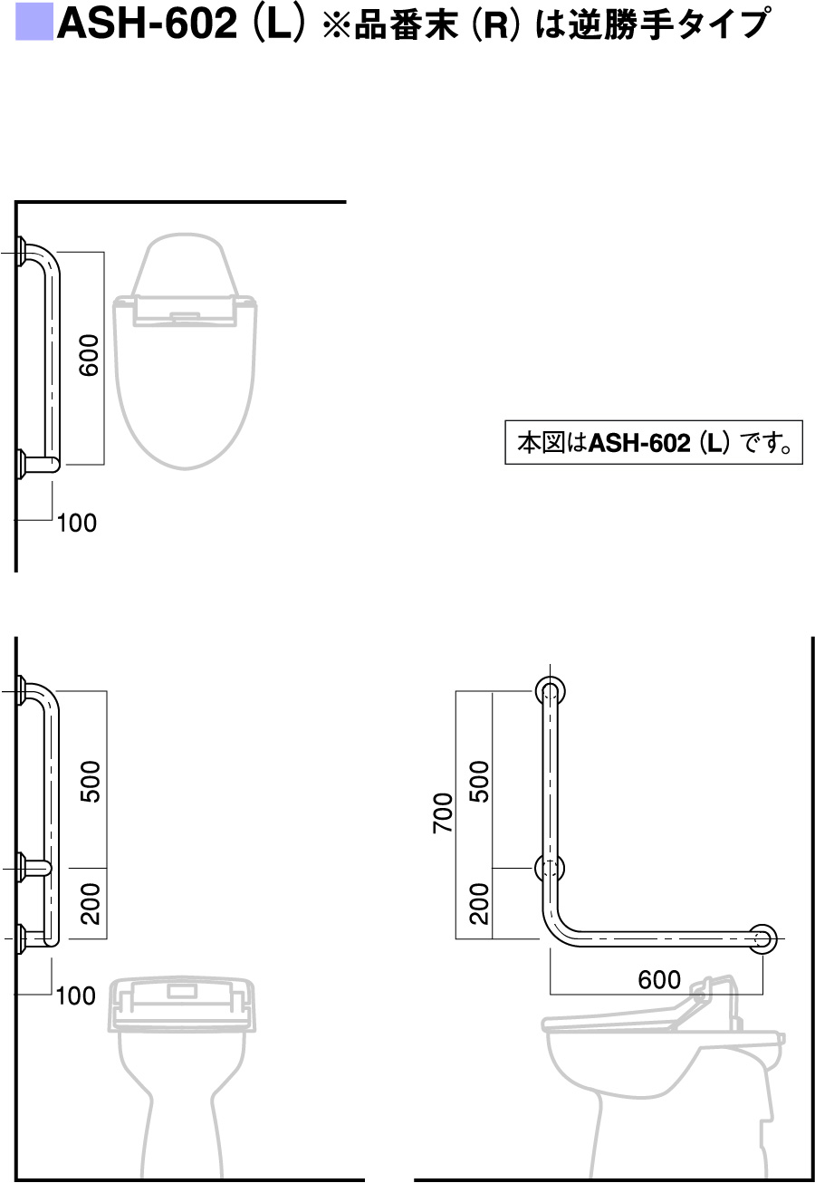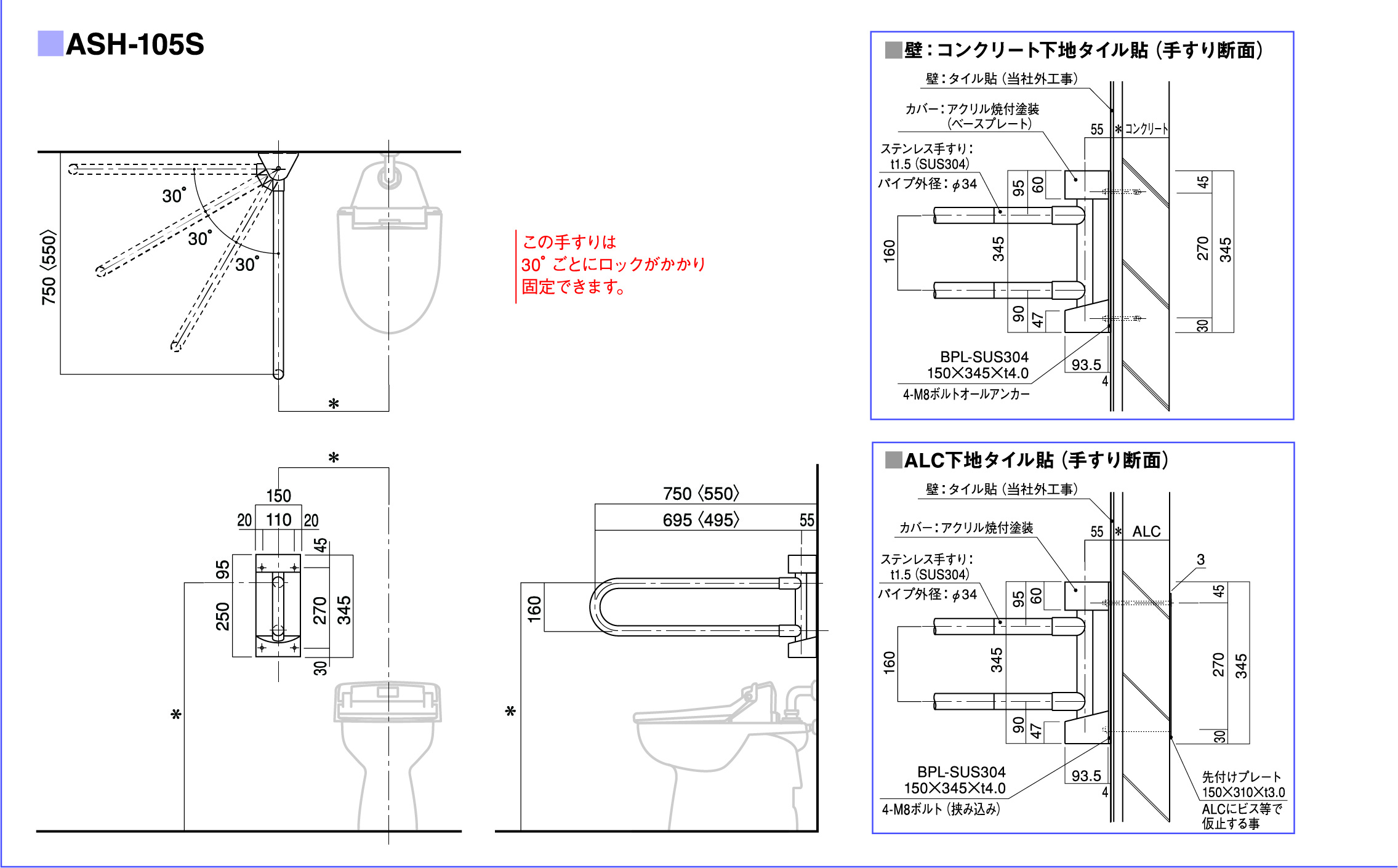 | パイプ外径 | Φ32、Φ34、Φ38 (可動式手摺り:ASH-105S・107Sについては、φ34のみ) |