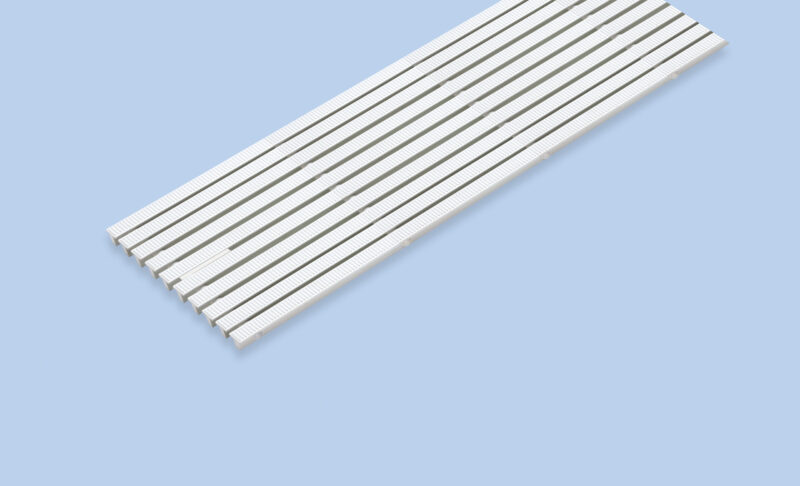 樹脂製みぞぶた〈プラスプール Sタイプ〉は、最小R500までの曲線対応が可能で、柔軟な設計に対応します。 本体カラーは9色から選択でき、設置場所の空間デザインに美しく調和。 巻き取り可能な構造により、清掃時の取り外しや移動も容易です。 素足でも心地よい凹凸加工を施しており、快適性と安全性を両立。 また、現場でのパーツ交換や調整も簡単に行える構造となっています。