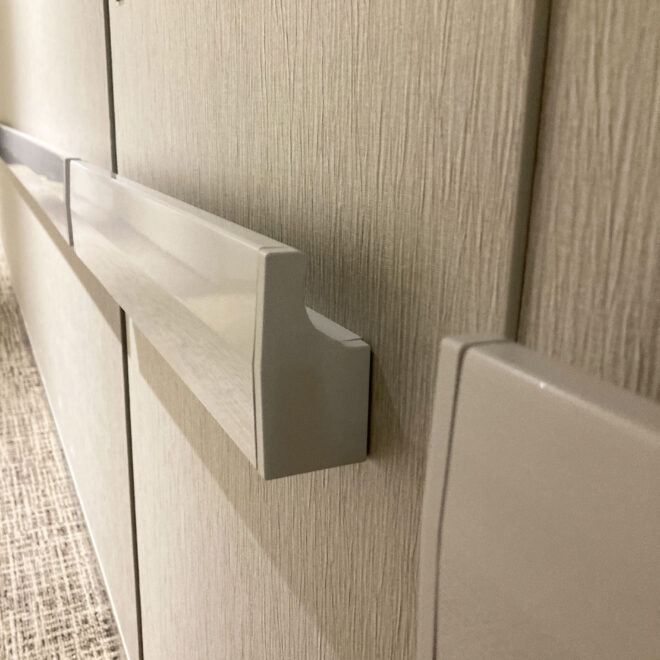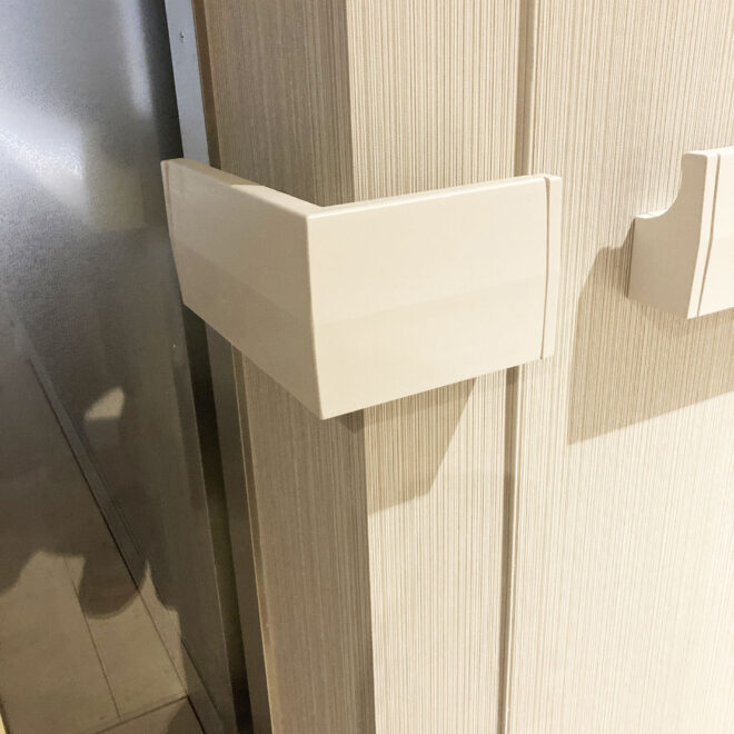 体を支えるという基本性能に加え、壁面保護の機能も備えた手摺りです。壁からの出幅はわずか50mmと非常にコンパクト。ブラケットのない一体型デザインを採用し、壁に直接接する形状により、すっきりとした印象と壁との一体感を生み出します。使いやすさと美しさを両立した、洗練された設計です。