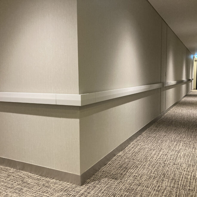 エアライン AL-102 は、直線的でコンパクトなフォルムが特長の手摺りです。すっきりとしたデザインが廊下の空間を損なうことなく、壁との一体感を生み出します。その洗練されたスタイルは、高級感を求めるホテルや公共施設、マンションのエントランス通路などに最適。上質で美しい空間を演出します。