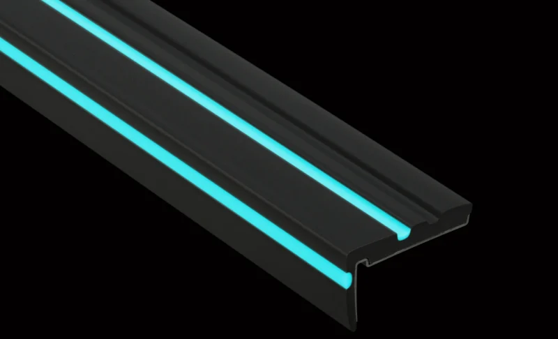 蓄光タイプのノンスリップ(MSR)は、停電時や消灯時における視認性を高める蓄光機能付きの滑り止め材です。 階段の段鼻に設置することで、蓄えた光を放出し、照明が消えた際にも段鼻位置を明示。安全な避難を促します。 本製品は保育園・幼稚園向け専用品として販売・施工しており、階段の前垂れ部の芯材まで樹脂タイヤが覆う構造により、転倒時の衝撃を軽減します。