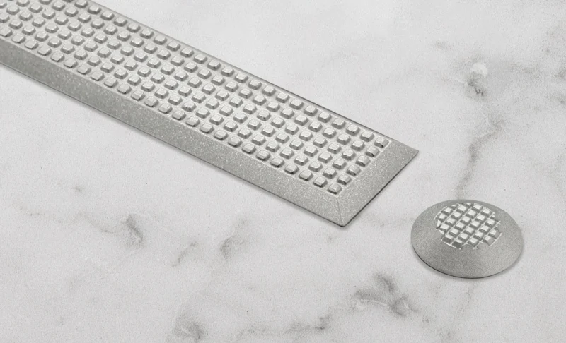 BEP仕上げの歩行用誘導鋲・点字鋲は、HL仕上げのようにステンレス表面に単一方向の研磨で生じる、細い筋目を施す仕上げと違い、特殊なBEP処理により高い防錆性を発揮します。塩害や湿気の影響を受けやすいプール施設や海岸近くの建物などにおいて、優れた耐久性を実現します。